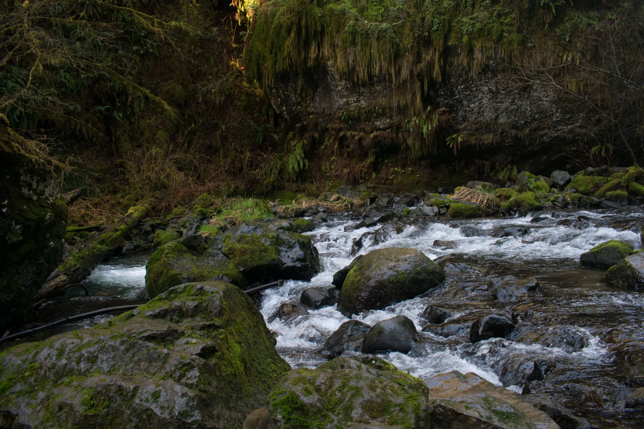 The creek of Drift Creek Falls water cascading over the rocks with rocks covered in green moss and lots of foliage covering the area. View fullsize