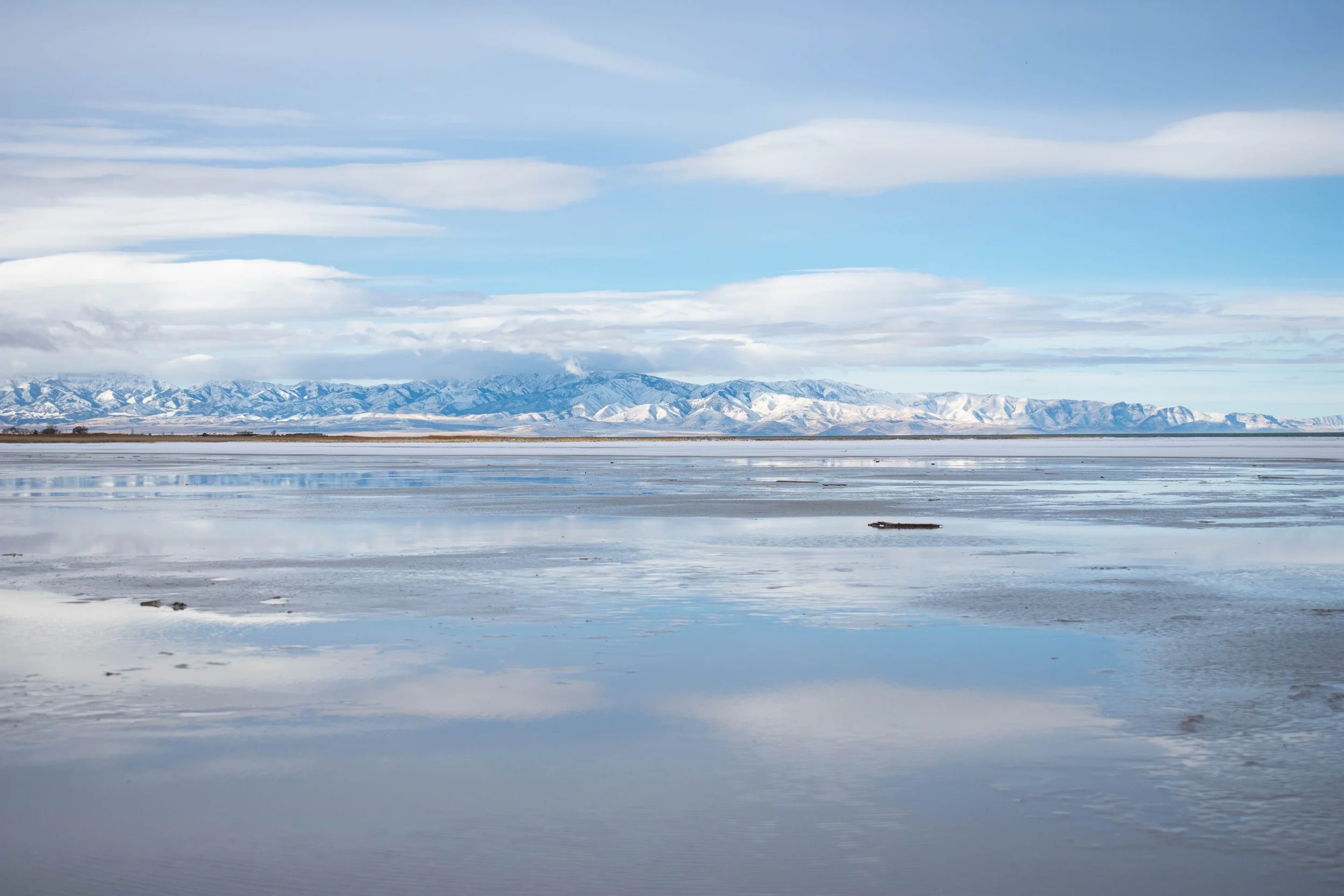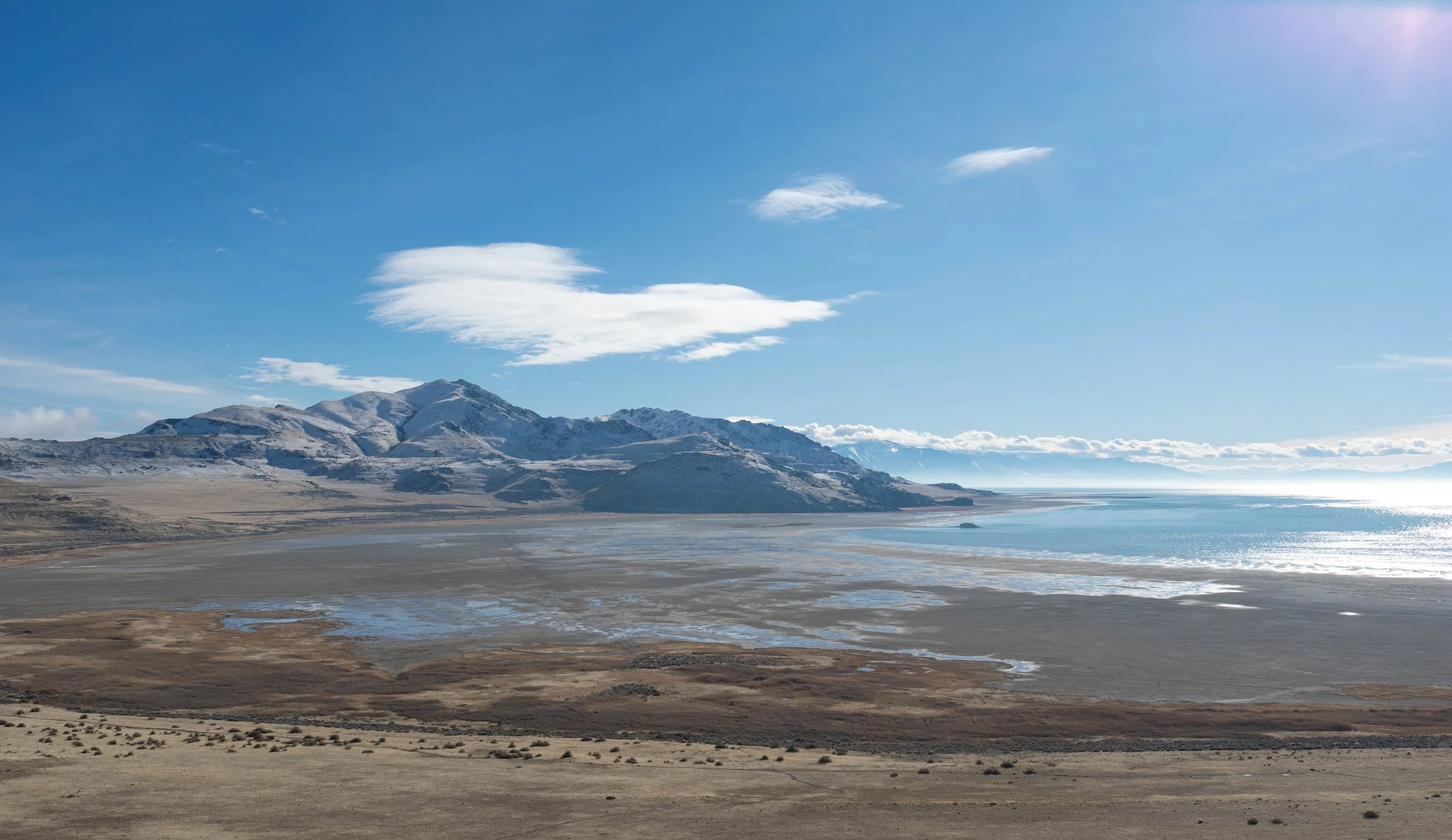 A sweeping expansive view of snow-capped mountains beyond a vast, dry shoreline under a clear blue sky with scattered clouds in Salt Lake City, Utah. View fullsize