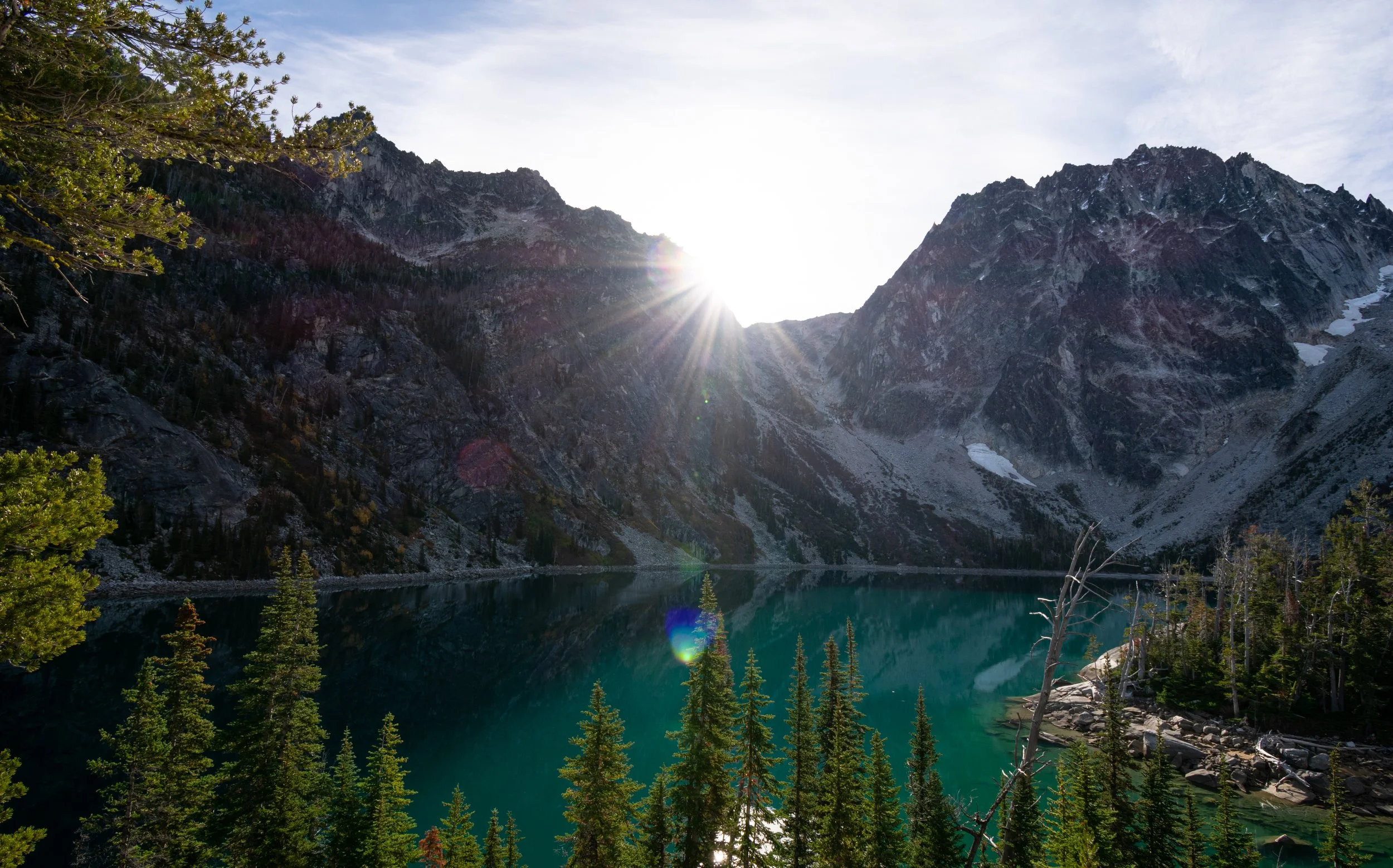 A stunning landscape of Colchuck Lake that gives off serene mountain lake vibes with crystal-clear turquoise water, reflecting the towering, rugged peaks in the background. The sun peeks over the mountains, creating a radiant sunburst effect and subt View fullsize