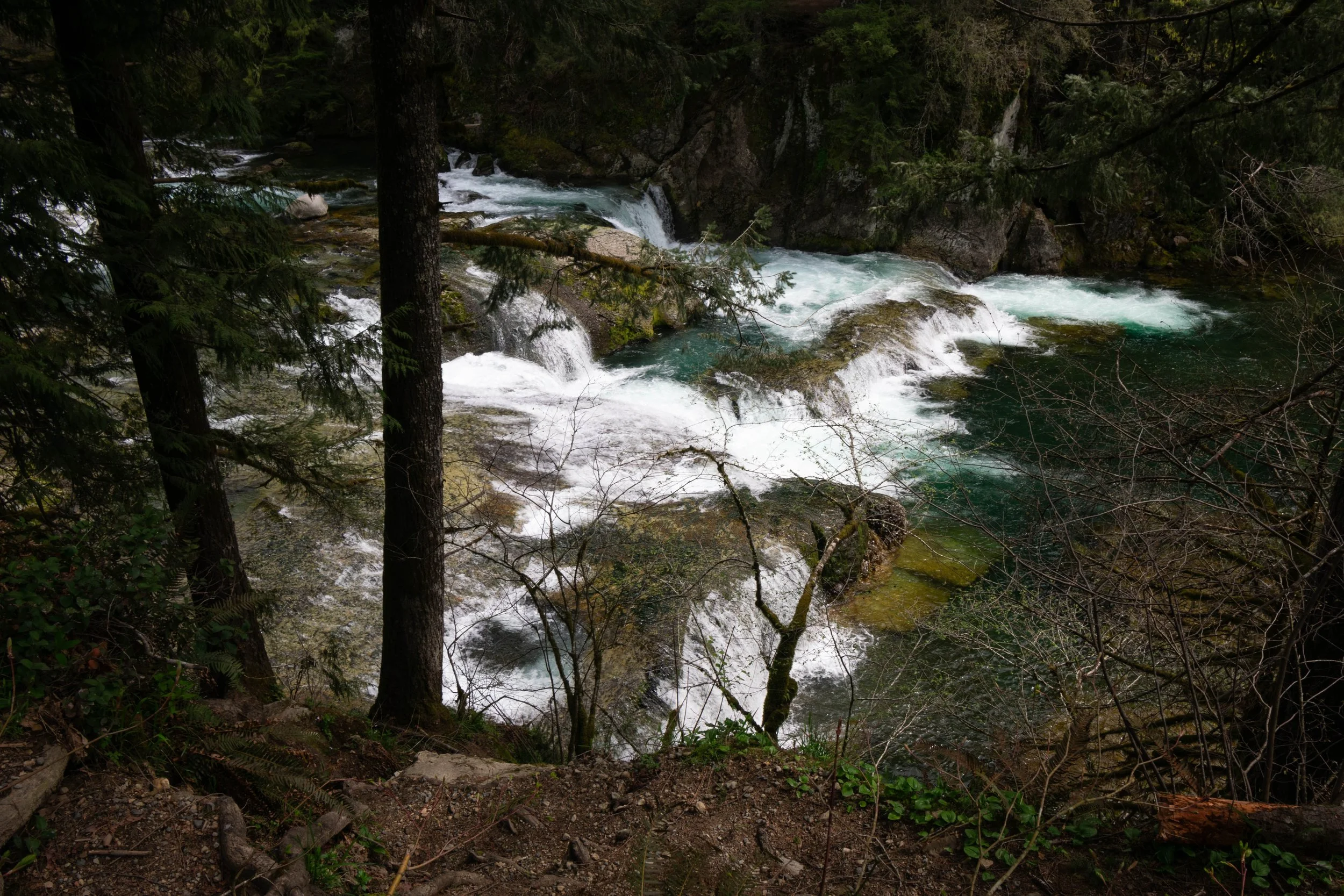 The serene Washougal River winds through a lush forest, surrounded by tall trees and vibrant greenery as it cascades on the rocks creating multiple smaller waterfalls. View fullsize
