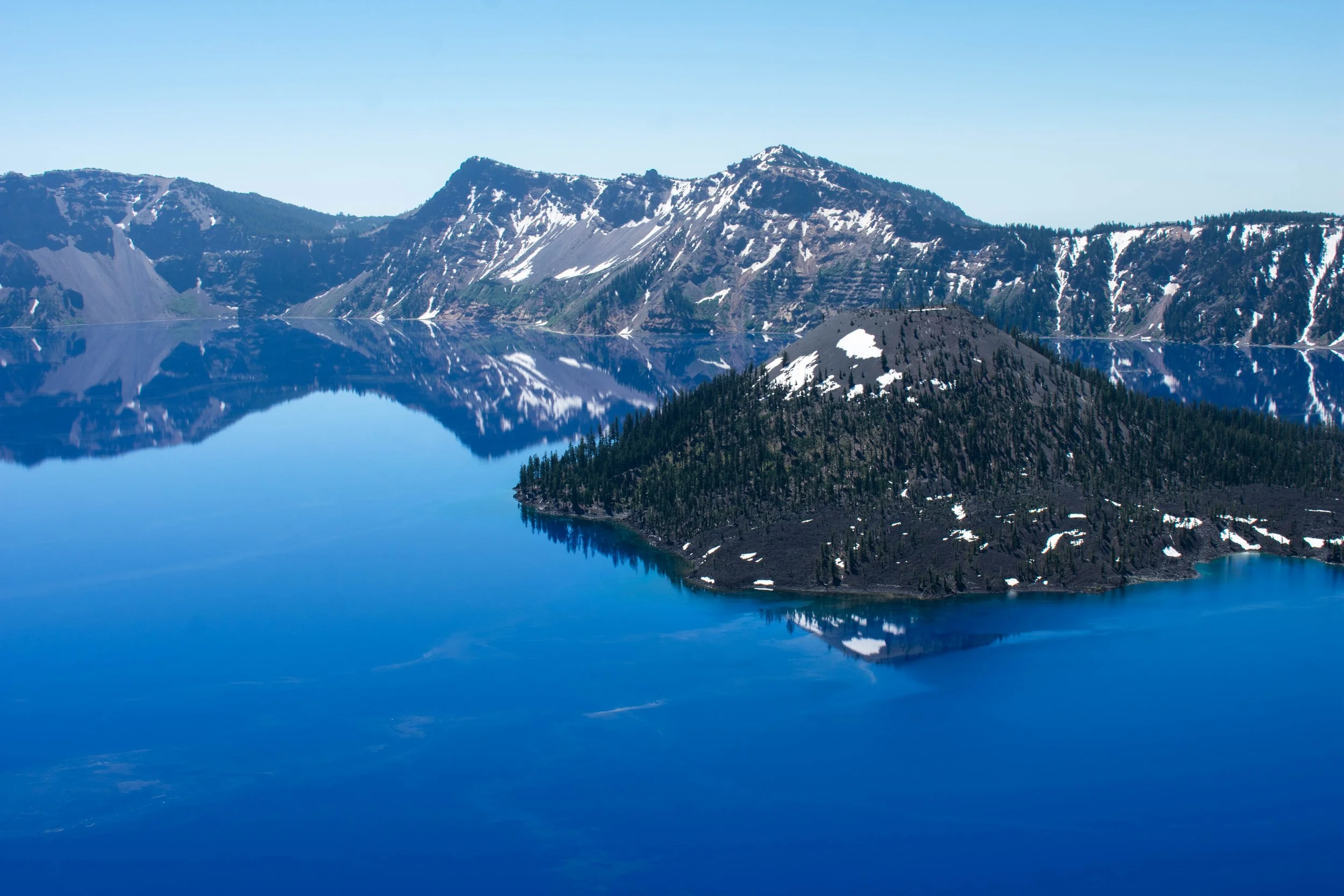 A breathtaking view of Crater Lake in Oregon, showcasing deep blue waters, clear light blue sky, an island with snow-capped peaks, and surrounding mountains reflecting in the lake. View fullsize