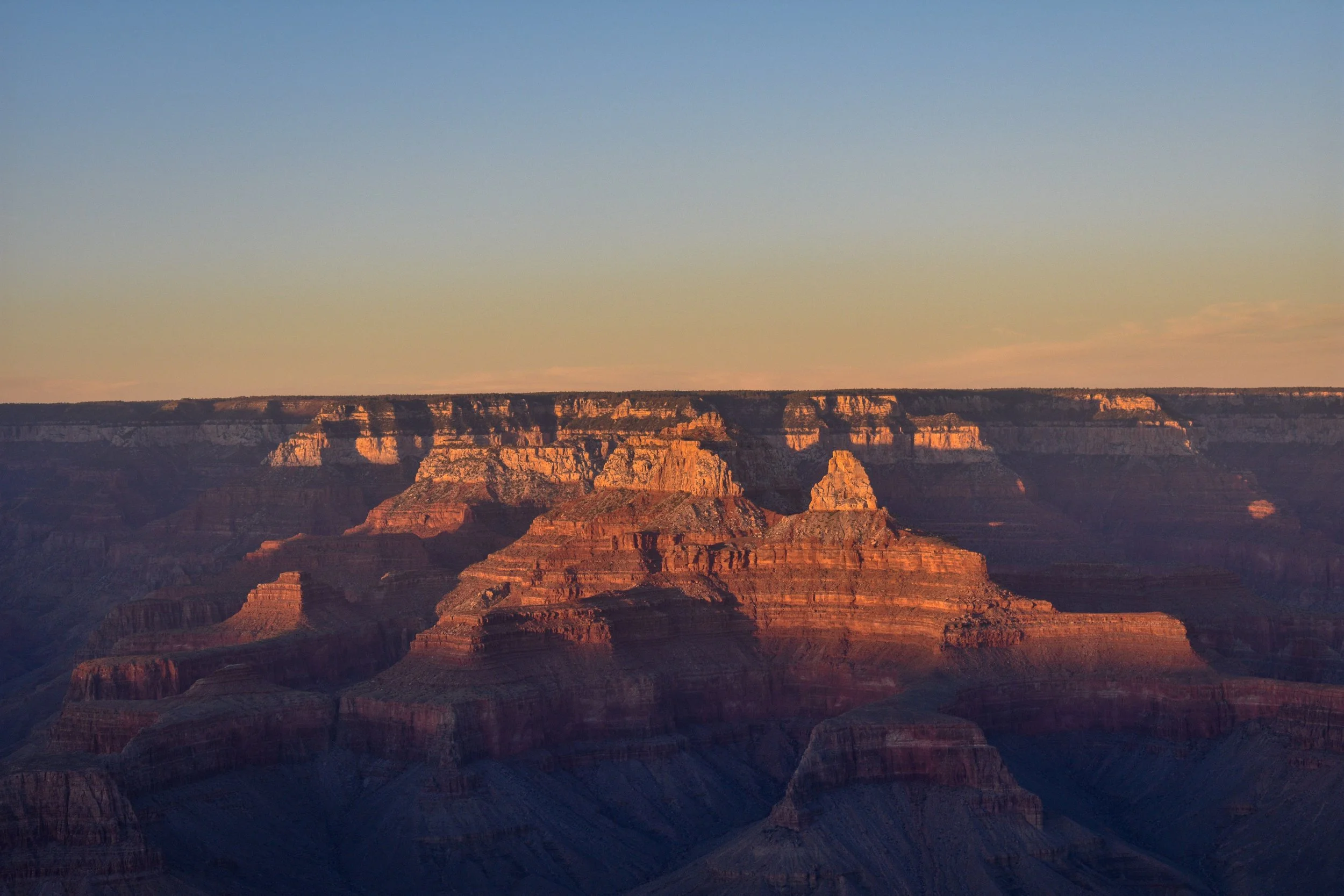 Sunset casts warm orange, golden hues over the layered rock formations of the Grand Canyon, highlighting its vastness and natural beauty with a light soft blue sky. View fullsize