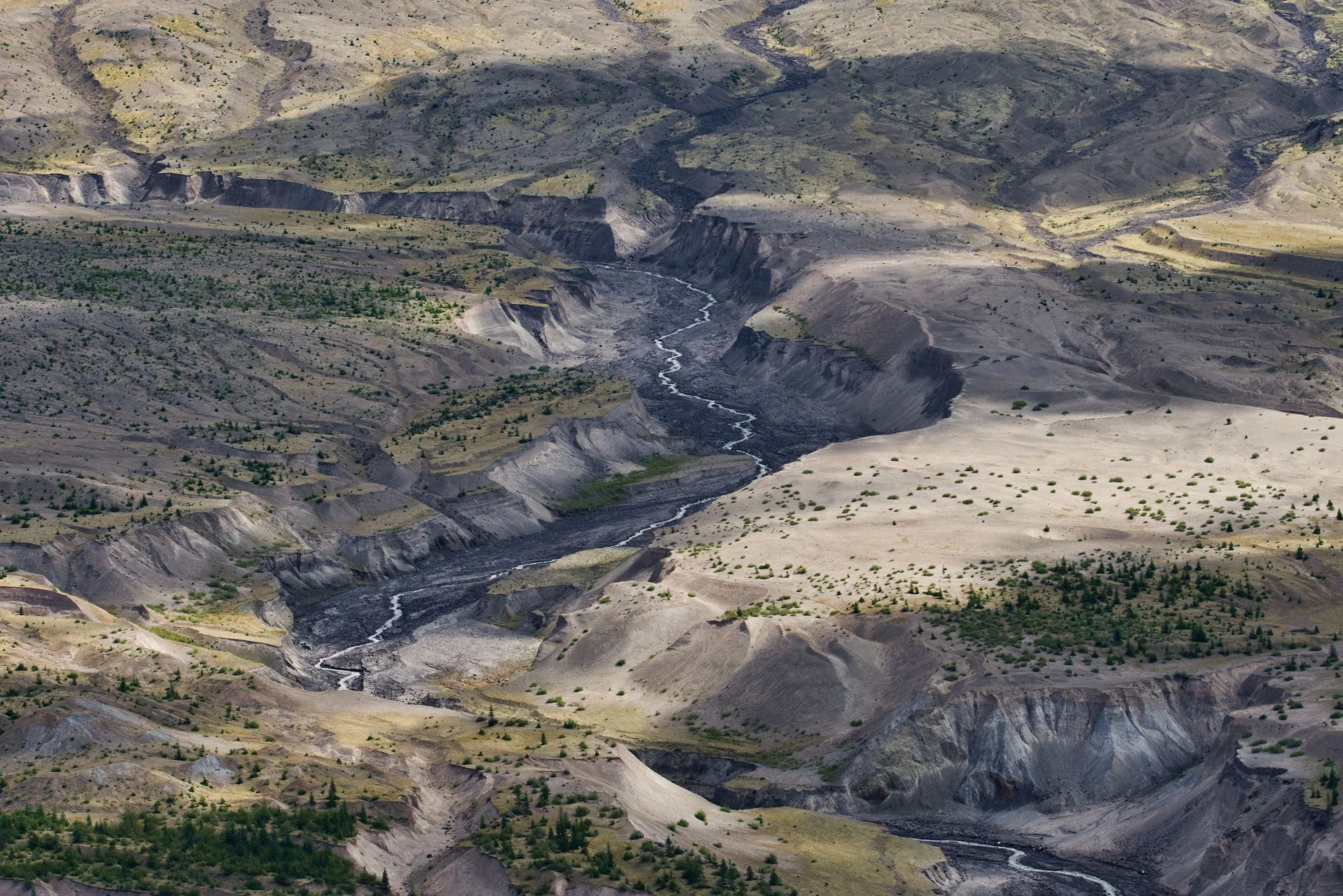 A top down view of the vast valley of Mt St Helens with a winding river flowing through its rocky rugged lush landscape, with harsh shadows and highlights giving life to the landscape. View fullsize